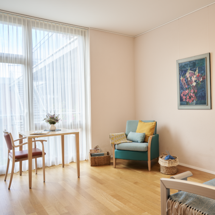Das Zentrum Schlossmatt Region Burgdorf besteht aus insgesamt sechs Häusern und elf Pflegeabteilungen. Backstein und grosszügigen Glasfronten sorgen für eine warme, lichtdurchflutete Atmosphäre. Die hellen Einbettzimmer mit eigener oder zu zweit genutzter Nasszelle können unsere Bewohnenden mit privaten Möbelstücken und Bildern individuell gestalten. Jede unserer Pflegeabteilungen verfügt über einen Tagraum mit offener Küche und Wohnbereich. Hier treffen sich die Bewohnenden um gemeinsam zu Essen oder Zeit zu verbringen.