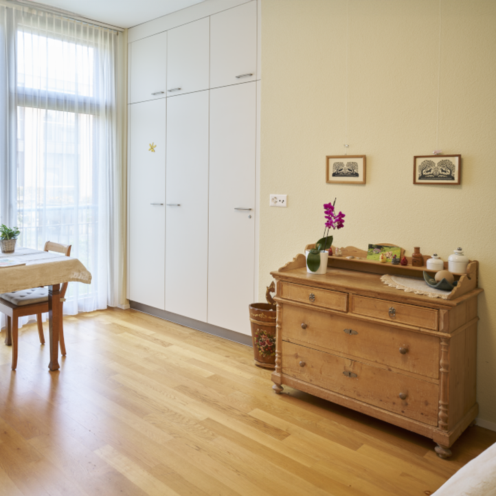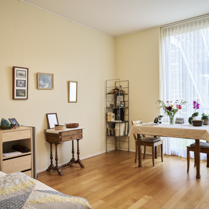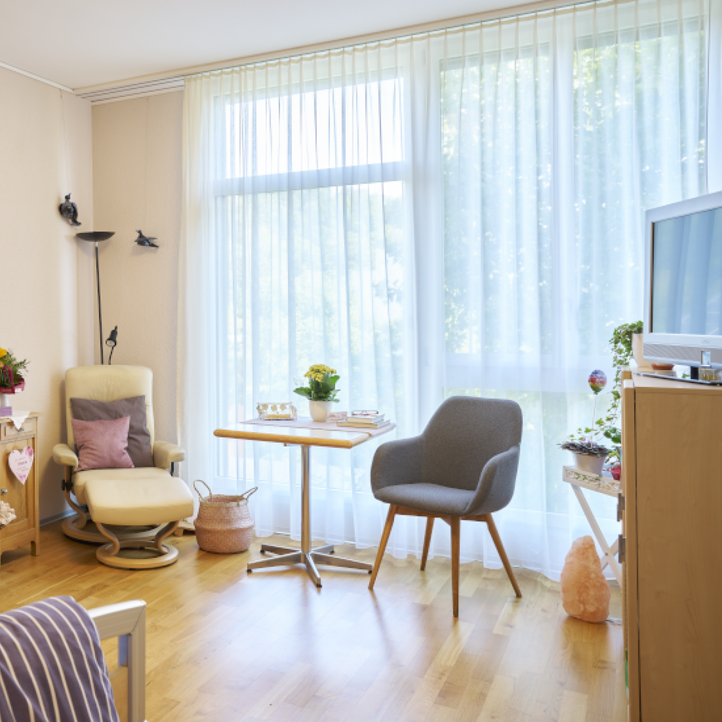 Das Zentrum Schlossmatt Region Burgdorf besteht aus insgesamt sechs Häusern und elf Pflegeabteilungen. Backstein und grosszügigen Glasfronten sorgen für eine warme, lichtdurchflutete Atmosphäre. Die hellen Einbettzimmer mit eigener oder zu zweit genutzter Nasszelle können unsere Bewohnenden mit privaten Möbelstücken und Bildern individuell gestalten. Jede unserer Pflegeabteilungen verfügt über einen Tagraum mit offener Küche und Wohnbereich. Hier treffen sich die Bewohnenden um gemeinsam zu Essen oder Zeit zu verbringen.